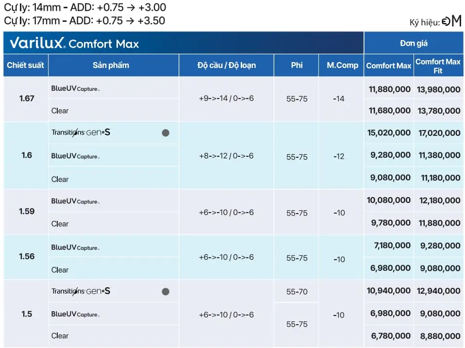 Bảng Giá Chi Tiết Tròng Kính Varilux Comfort Max
