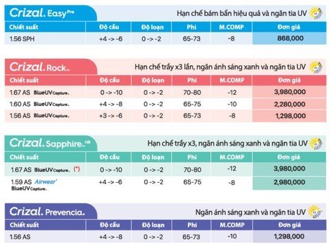Tùy theo nhu cầu cụ thể, bạn có thể lựa chọn dòng sản phẩm Crizal phù hợp nhất: Crizal Prevencia cho người làm việc nhiều với thiết bị điện tử, Crizal Sapphire HR cho người đề cao độ trong suốt tuyệt đối, Crizal Rock cho người có lối sống năng động, hoặc Crizal EasyPro cho giải pháp cơ bản với chi phí hợp lý.