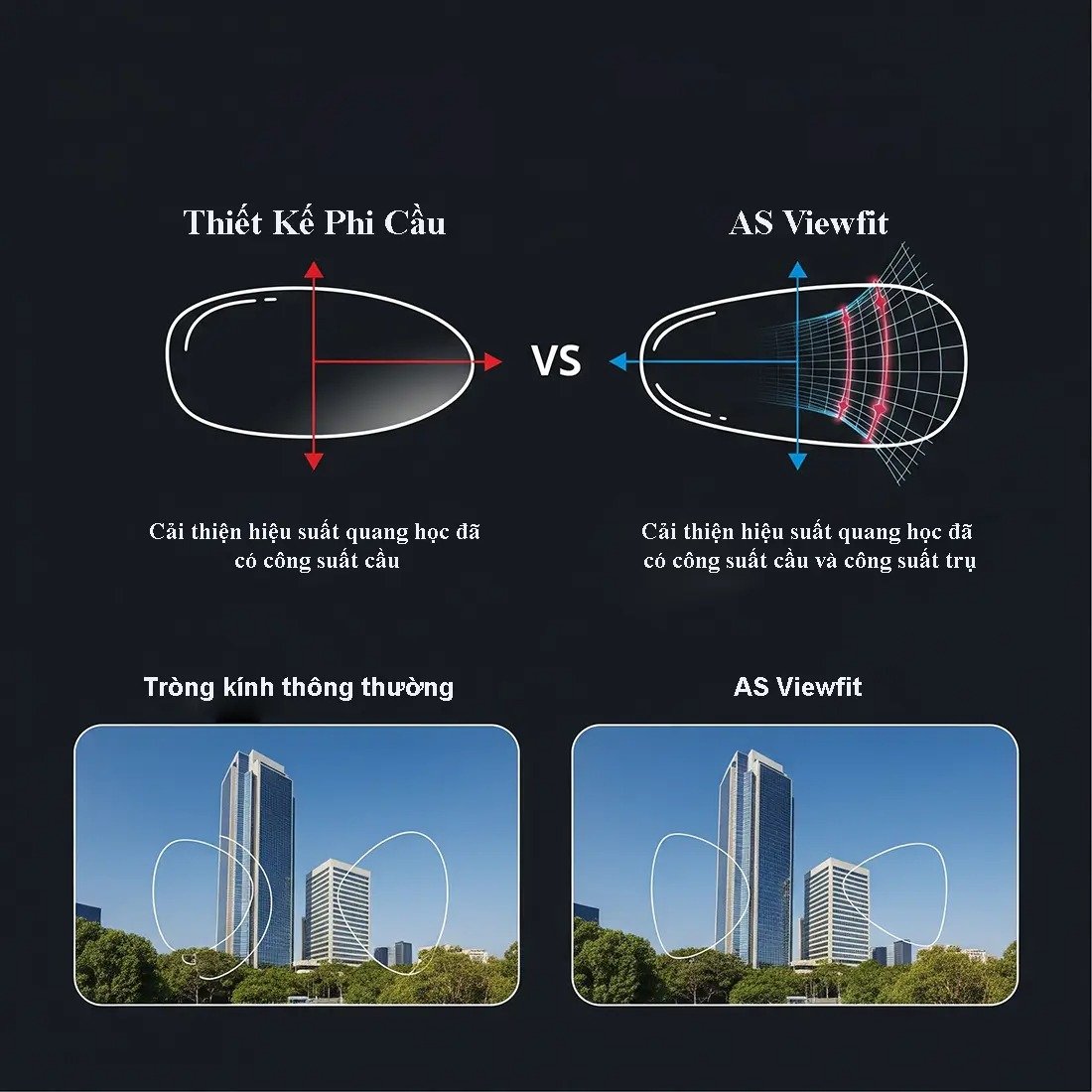 Khác với tròng kính thông thường có bề mặt hình cầu, AS Viewfit sử dụng thiết kế phi cầu làm giảm độ cong của bề mặt tròng kính, đặc biệt là ở các cạnh.