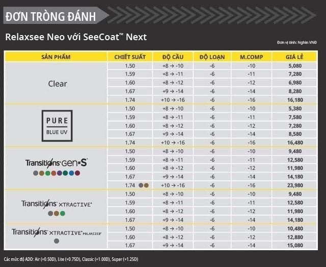 * Giá tùy theo chiết suất và tùy chọn lớp phủ